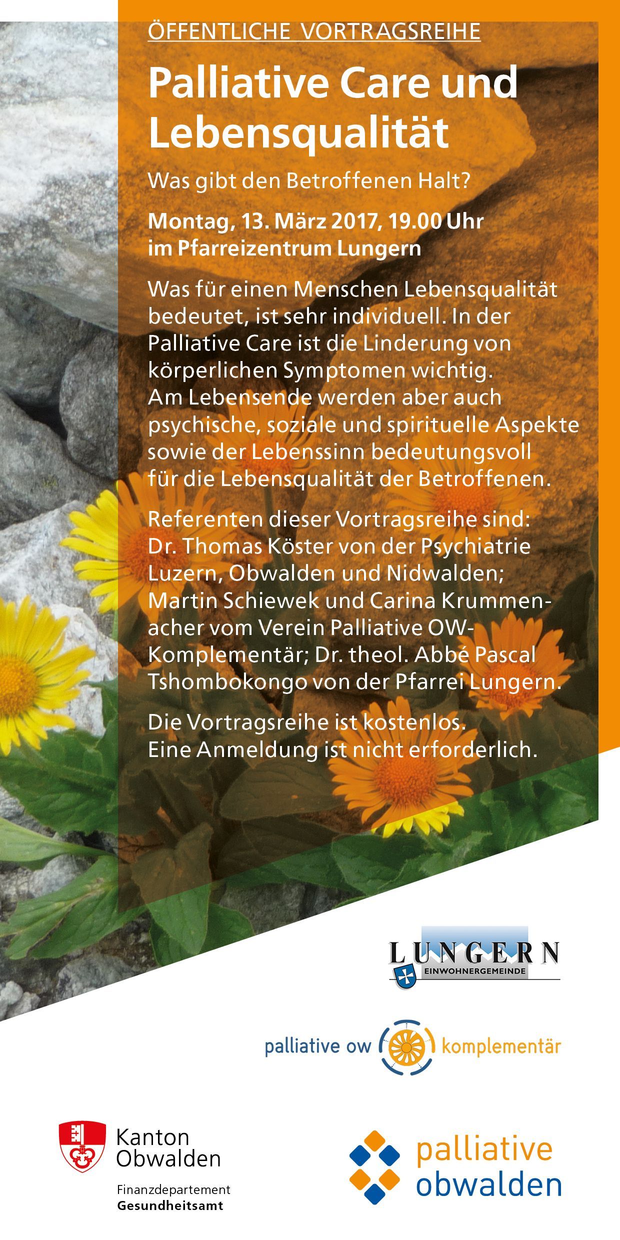 Die Arbeitsgruppe Palliative Care des Kantons Obwalden will die Bevölkerung mit einer Veranstaltungsreihe zu den verschiedensten Aspekten von Palliative Care sensibilisieren. Nach den letztjährigen Veranstaltungen in Engelberg und Sachseln mit jeweils über 100 Zuhörerinnen und Zuhörern findet am 13. März 2017 in Lungern der nächste Sensibilisierungsanlass statt.