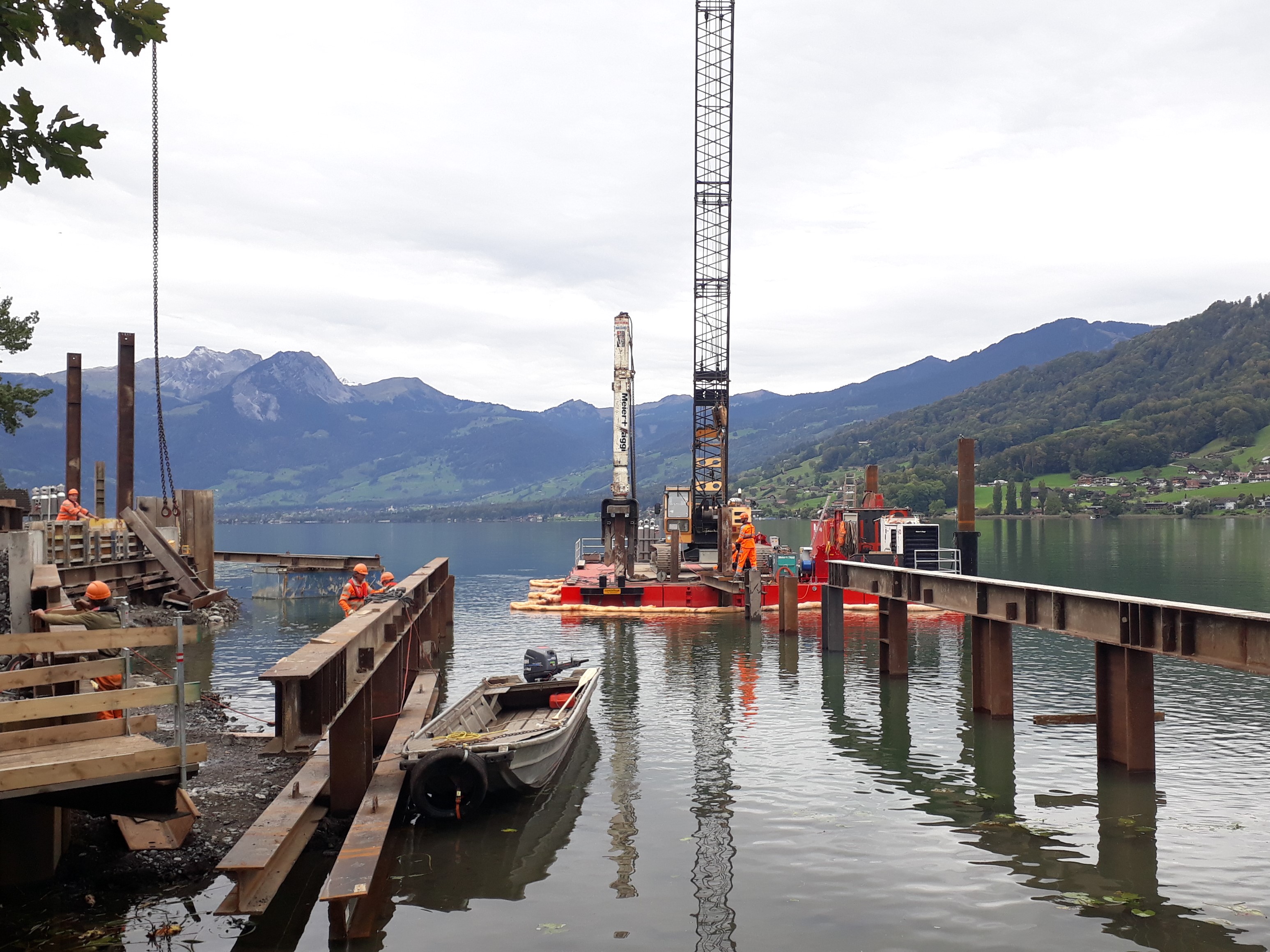 Die Bauarbeiten am Einlaufbauwerk in Sachseln laufen wie geplant und sind auf Kurs. Nachdem die Baustellenzufahrt ab der Brünigsstrasse fertiggestellt werden konnte, entsteht aktuell die Baugrube im Sarnersee. Aus der Baugrube wird später der Gegenvortrieb aufgefahren. Wegen der beschränkten Platzverhältnisse wird ein senkrechter Baugrubenabschluss mittels Spundwänden realisiert. Gestützt wird das Abschlusssystem mit einem Spriessring. Gegenwärtig sind die Baufachleute daran, die schweren Stahlträger in den Seeboden einzurammen. Dabei werden die Arbeiten ab einer schwimmenden Plattform (Ponton) ausgeführt. Die Baugrube wird im Frühsommer 2020 fertig ausgehoben und gesichert sein. Mit dem Gegenvortrieb kann in der zweiten Jahreshälfte 2020 begonnen werden.