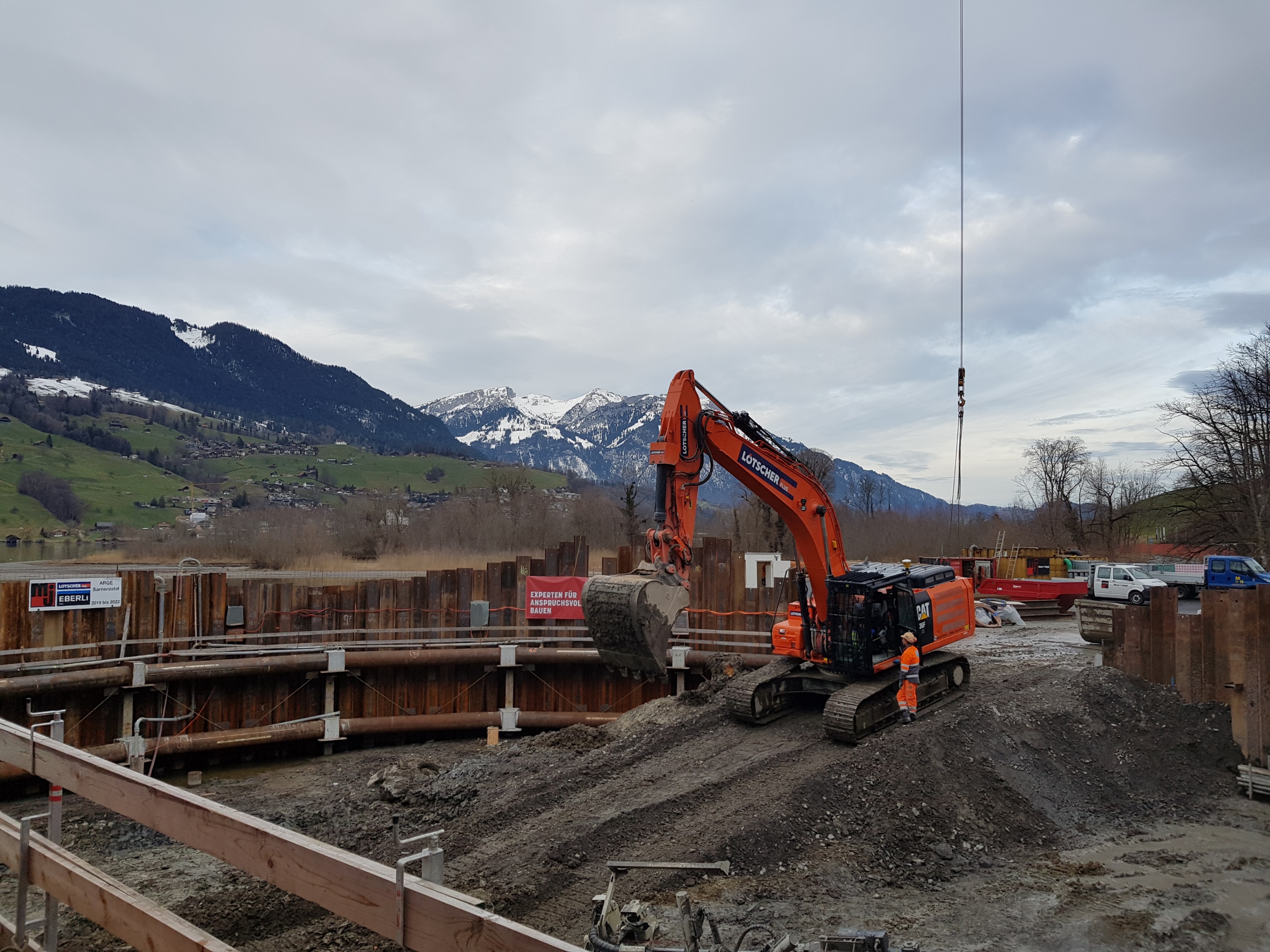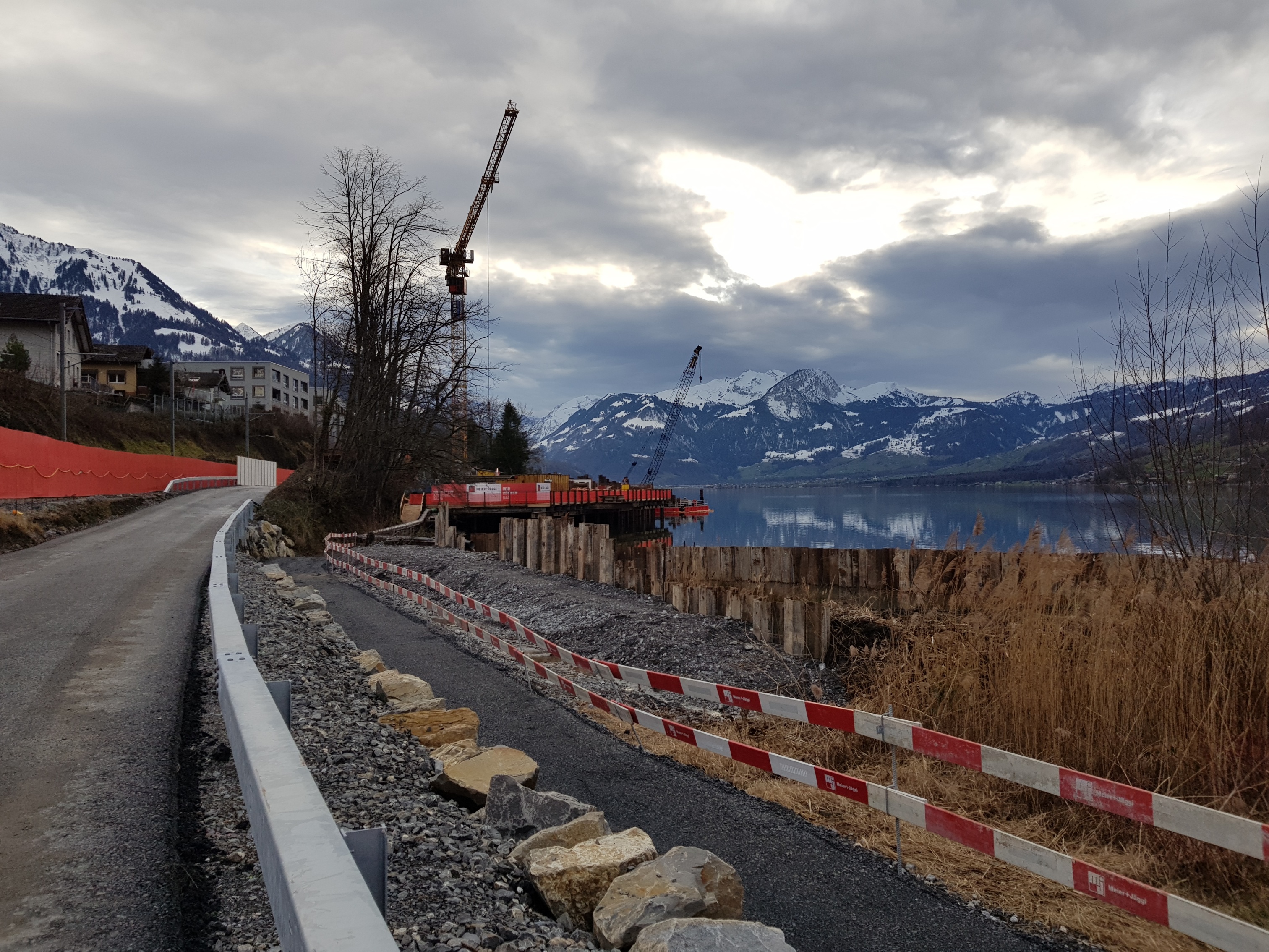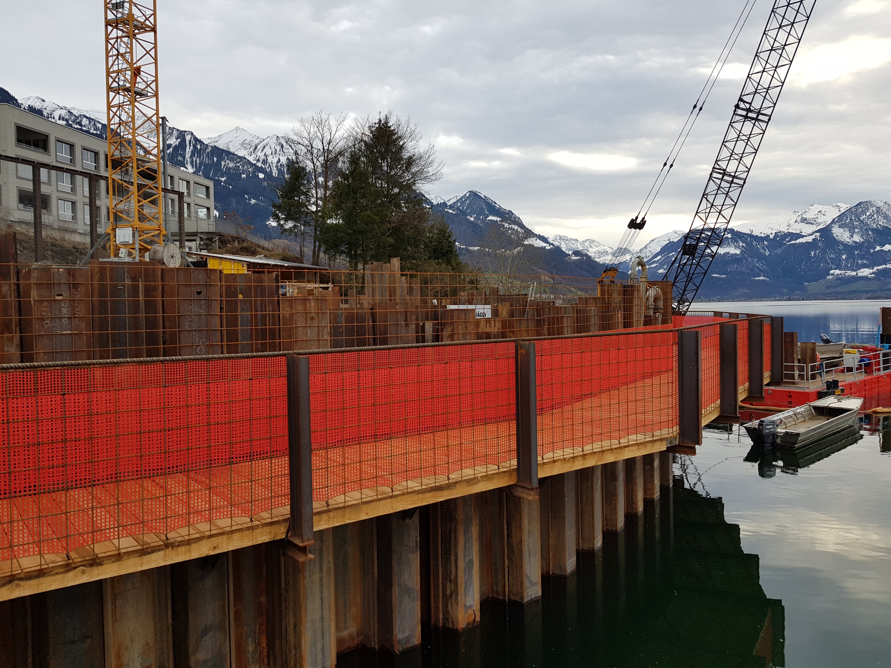 Die Bauarbeiten am Einlaufbauwerk des Entlastungsstollens laufen auf Hochtouren. Der Baugrubenabschluss im offenen Wasser ist mittlerweile erstellt und der Seewasserspiegel abgesenkt. Aktuell ist der Unternehmer daran, die anstehenden Seeablagerungen auszupacken und die Baugrube auf das Niveau des späteren Gegenvortriebs abzutiefen. Die Baugrube wird bis im Sommer 2020 fertig ausgehoben und gesichert sein. Der Gegenvortrieb beginnt gemäss Terminprogramm im Spätsommer 2020.