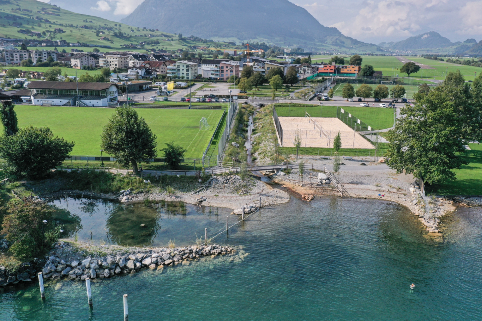 Im Buochser Seefeld (NW) wurde die Gelegenheit beim Schopf gepackt: Die gelungene Revitalisierung des Mühlebachs und des angrenzenden Seeufers bringt ökologischen und landschaftlichen Gewinn. Fische, Insektenlarven und andere Wasserlebewesen, aber auch Vögel, Kleinsäuger, Amphibien und Reptilien finden hier einen passenden Lebensraum.