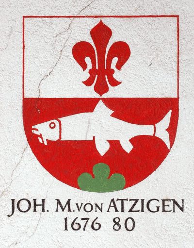 Geteilt von Silber und Rot, in verwechselter Tinktur oben eine Lilie, unten über grünem Dreiberg ein Fisch (Barbe?).