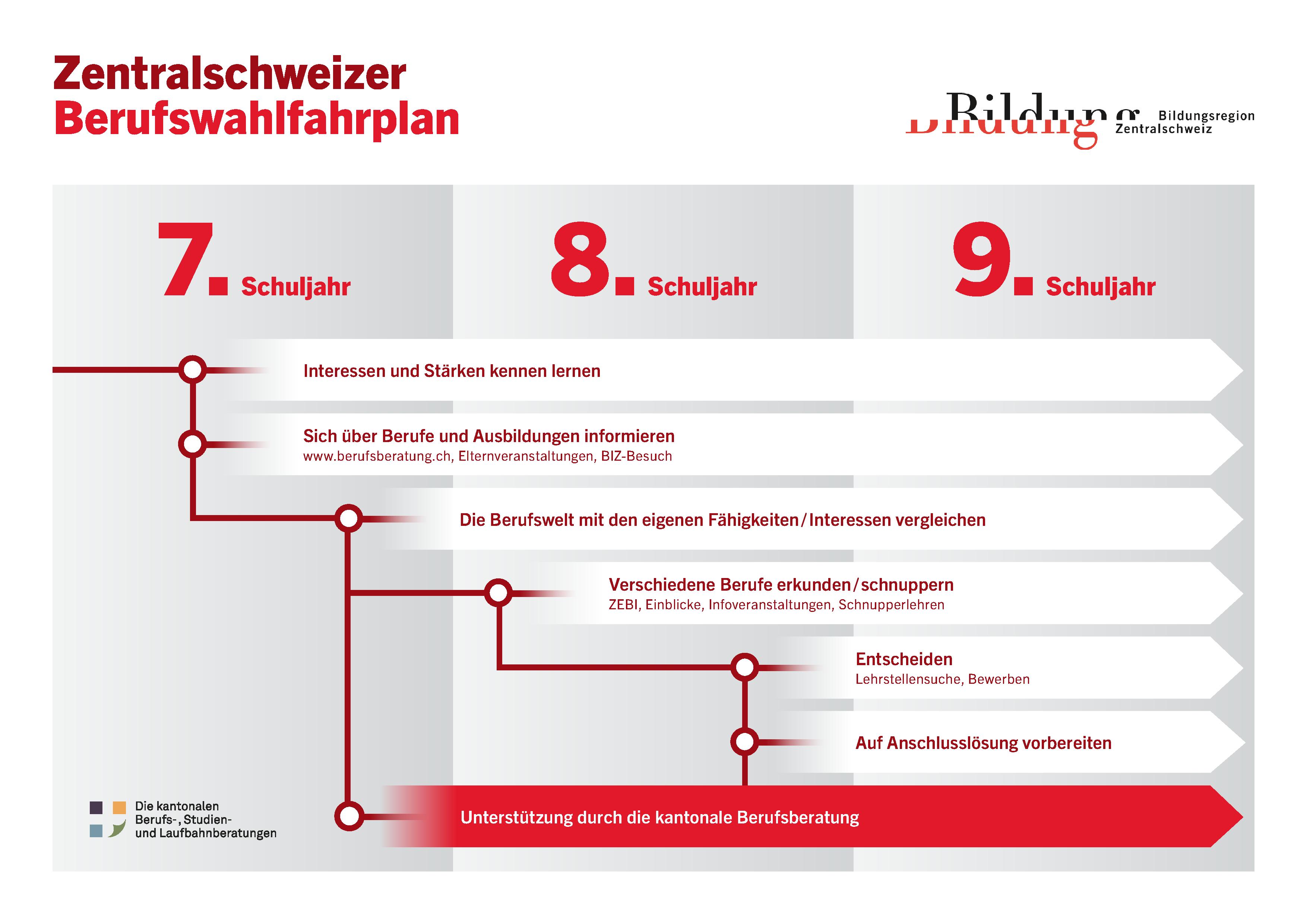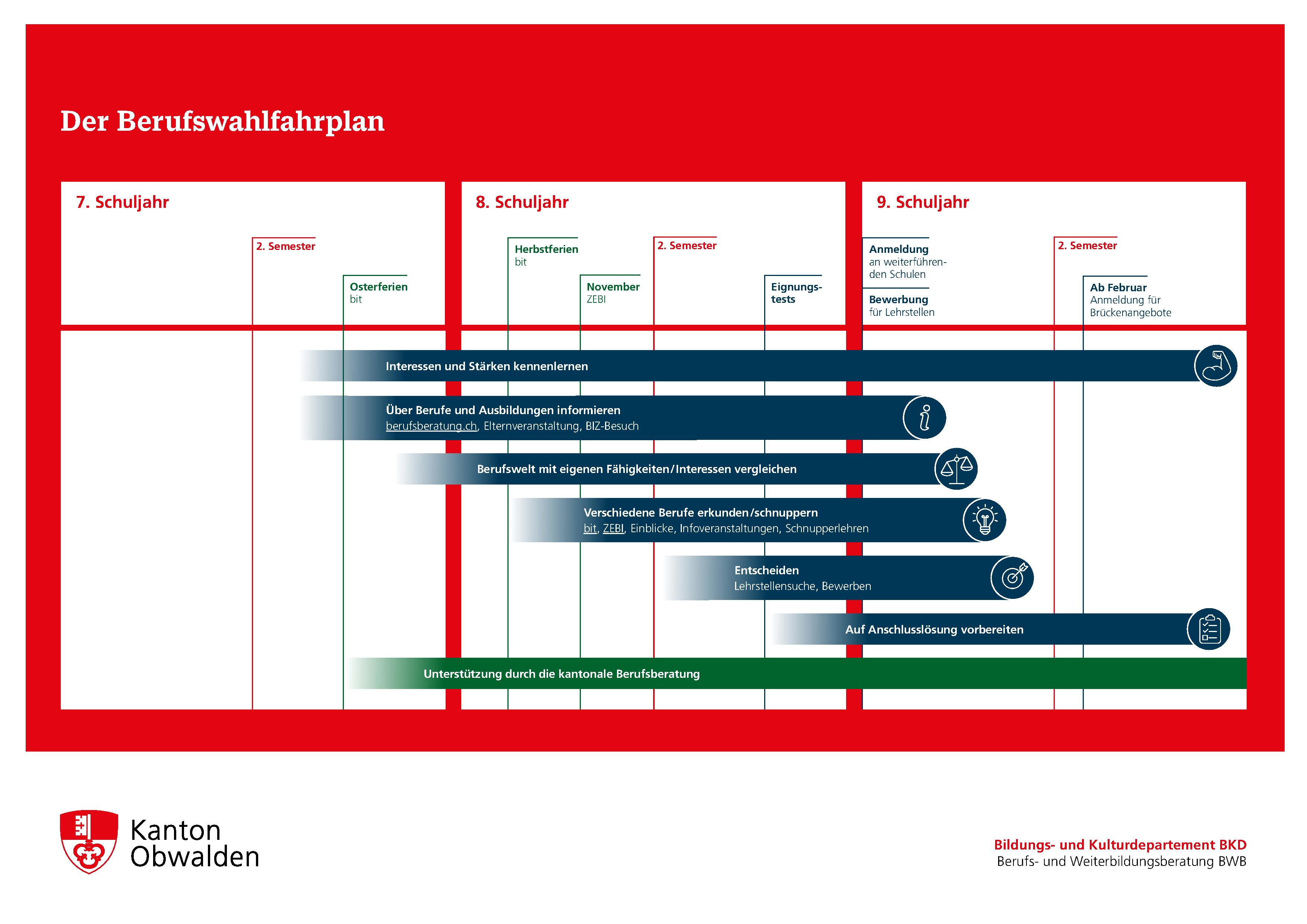 Die kantonalen Berufs-, Studien- und Laufbahnberatungen aller Zentralschweizer Kantone haben gemeinsam einen Zentralschweizer Berufswahlfahrplan erarbeitet, um interkantonalen Berufsverbänden, Unternehmen und weiteren Organisationen eine abgestimmte Orientierung über den Berufswahlprozess zu geben. Für die Obwaldner Jugendliche gilt der Obwaldner Berufswahlfahrplan, der sich stark am Zentralschweizer Berufswahlfahrplan anlehnt.