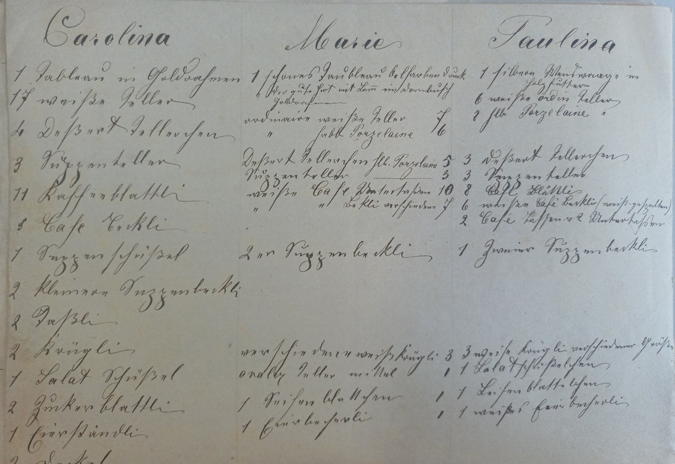 Trotz des hohen materiellen Anspruchs spiegelt sich im Nachlass auch eine kontrollierte, wenig personalisierte Form der Repräsentation wider. Persönliche oder künstlerische Gegenstände sind nur vereinzelt verzeichnet: Carolina erhielt die Porträts ihrer Eltern in Goldrahmen sowie eine silberne Sackuhr, Marie einige alte Bücher und ein Bild mit dem Titel „Der gute Hirt mit Lamm“, Paulina hingegen eine silberne Wandwaage. Insgesamt vermittelt der Hausrat das Bild einer wohlhabenden bürgerlichen Familie, deren Alltag von Qualität, Funktionalität und repräsentativem Anspruch, zugleich aber auch von Zurückhaltung im persönlichen Bereich geprägt war.