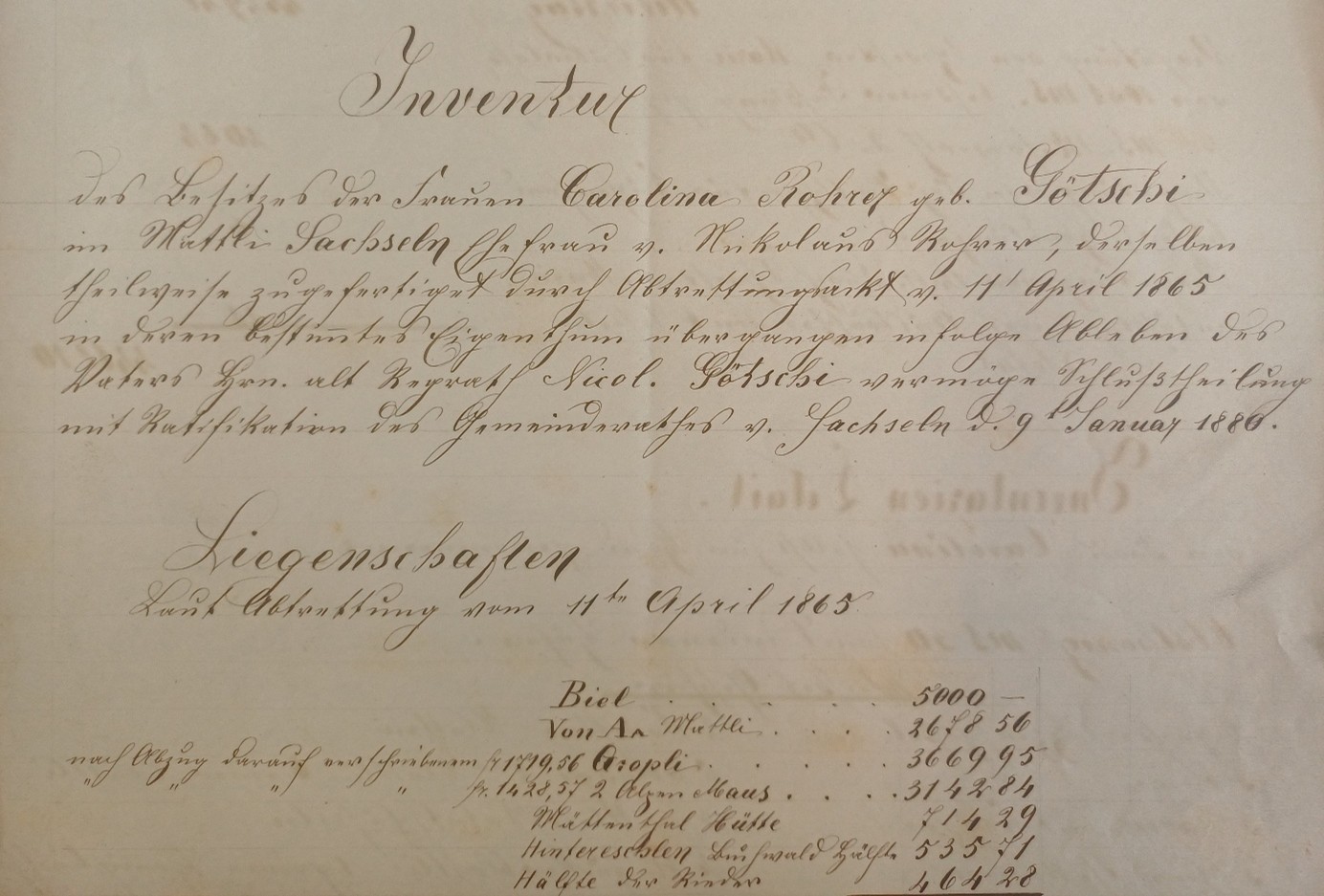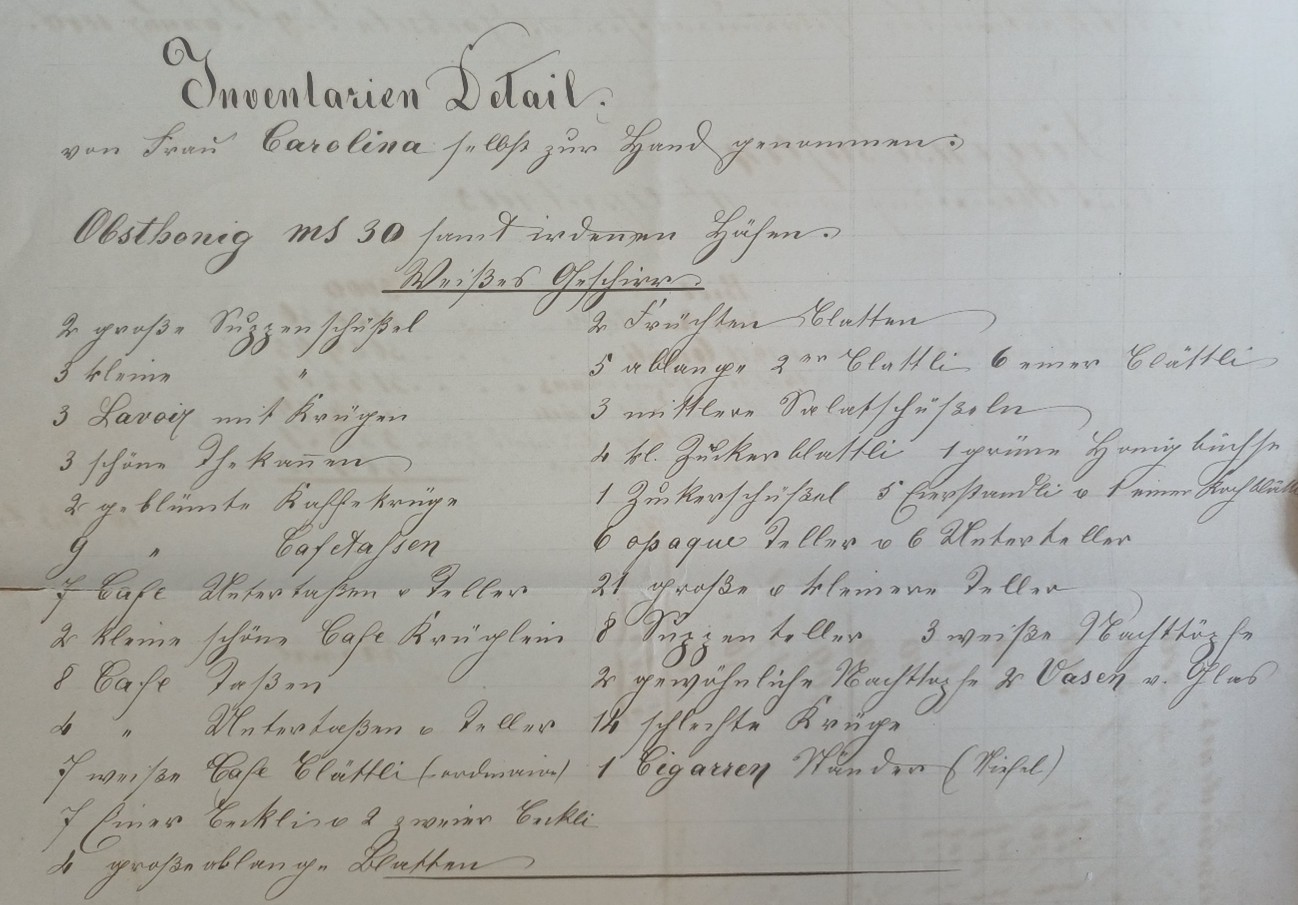 Historische Nachlassinventare sind weit mehr als blosse Auflistungen von Zahlen und Gegenständen. Sie stellen wichtige, jedoch oft übersehene Quellen der Sozial-, Geschlechter- und Kulturgeschichte dar. Je nach Grad ihrer Ausführlichkeit geben sie Aufschluss über zeitgenössische Wohn- und Esskulturen, Kleidermoden sowie in die finanzielle Situation einer Person. Die Überlieferung solcher Inventare ist dabei keineswegs selbstverständlich: Als rechtlich-administrative Dokumente besitzen sie meist nur einen begrenzten zeitlichen Nutzen und werden selten mit Blick auf eine dauerhafte Aufbewahrung erstellt. In diesem Zusammenhang erweist sich das kürzlich durch das Staatsarchiv Obwalden erschlossene Familienarchiv der Sachsler Familie Rohrer-Omlin (P.0192) als wahre Fundgrube – nicht zuletzt, weil es einen hohen Anteil an Nachlassdokumenten für und von Frauen enthält. Dazu zählt auch das Inventar des Regierungsrates und „Kreuz-Wirtes“ Niklaus Götschi (1793–1879), der seinen drei Töchtern einen beachtlichen Besitz hinterliess (P.0192.02). Diese Quelle erlaubt einen seltenen und eindrucksvollen Einblick in die Lebenswelt einer wohlhabenden Obwaldner Ratsfamilie des 19. Jahrhunderts.